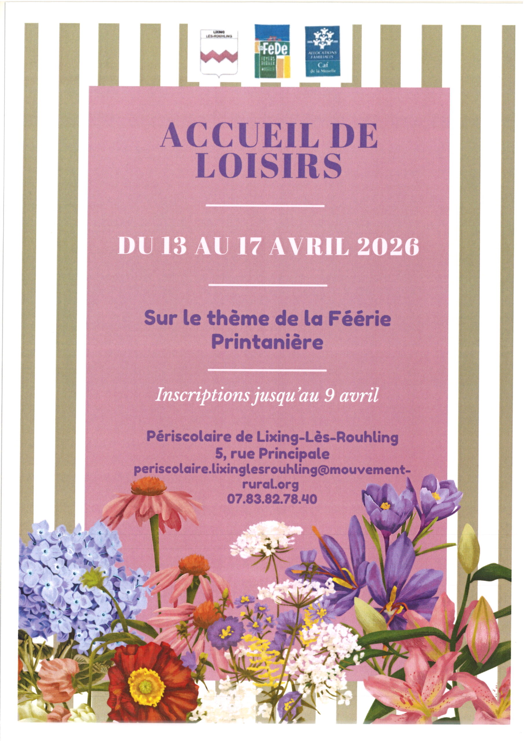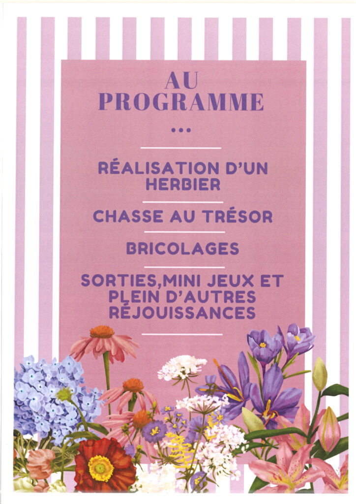 L’accueil de loisirs ouvrira ses portes pendant les vacances de printemps du lundi 13 au vendredi 17 avril. Les enfants seront accueillis dans un cadre convivial et sécurisé, avec un programme d’activités varié adapté à leur âge.